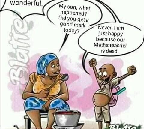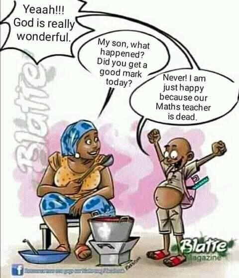 Son: Yeaah!!! God is really wonderful. Never! I am just happy because our Maths teacher is dead.